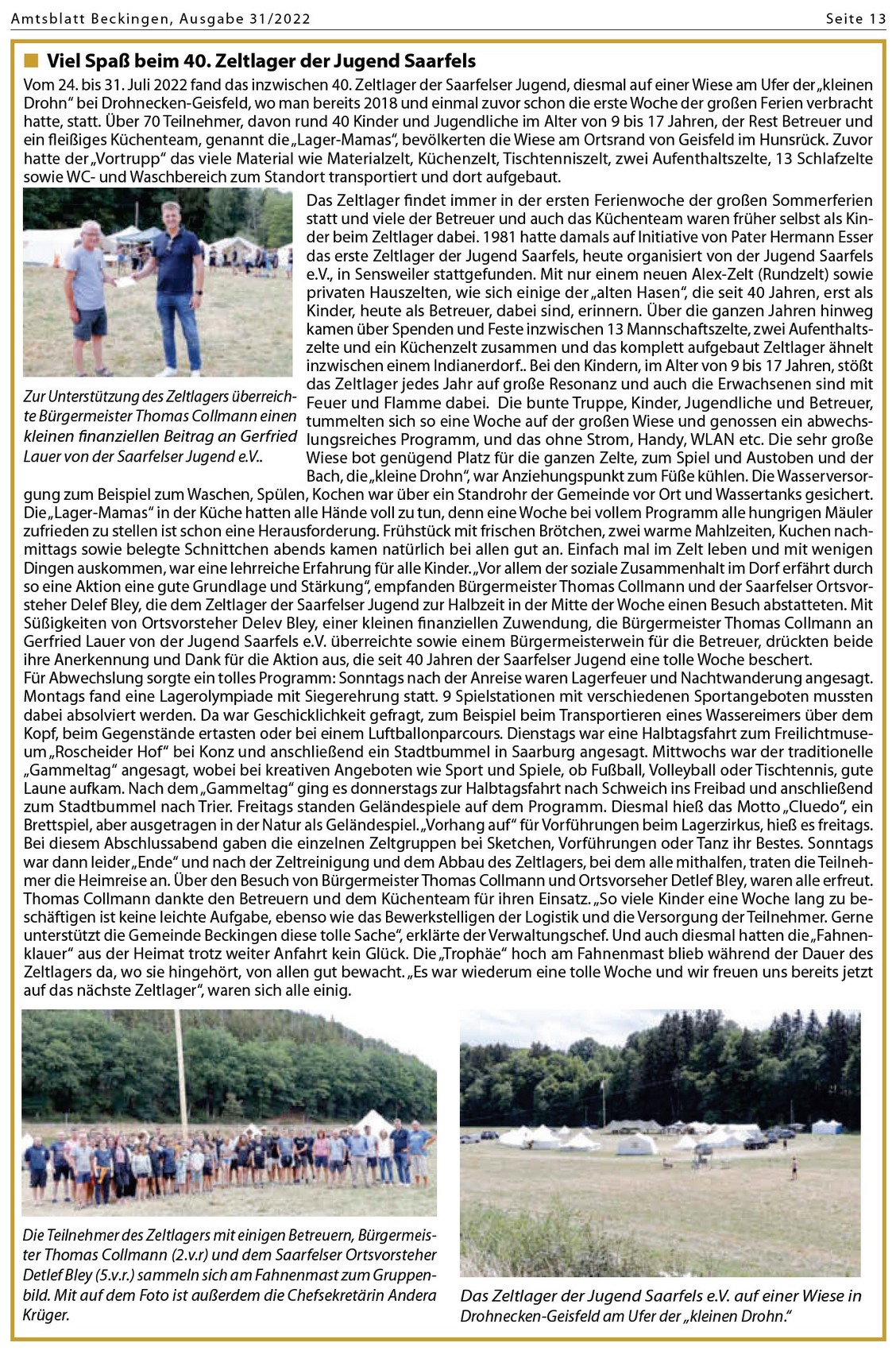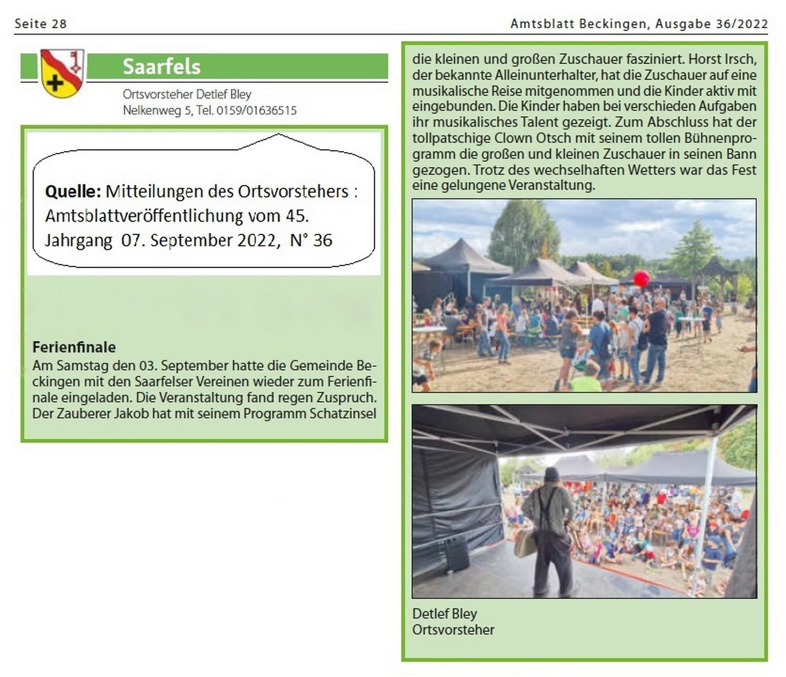 ![]() Quelle: Mitteilungen der Vereine / Amtsblattveröffentlichung vom (45. Jahrgang | 3. August 2022 | N° 31) |