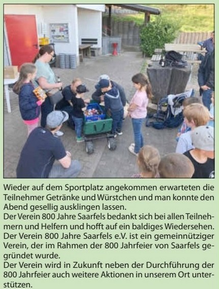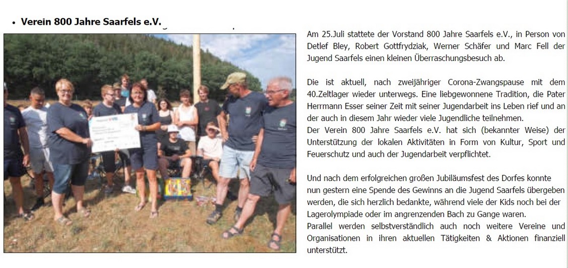 In einer kleinen Feierstunde wurde im Garten der Sinne in Merzig von der Landrätin Daniel Schlegel Friedrich das Ergebnis der Dorfbewertung bekanntgegeben. Es haben 11 Dörfer aus dem Landkreis Merzig-Wadern teilgenommen. Saarfels hat einen respektablen 5. Platz erreicht. Wir erhalten einen Prüfungsbericht über unser Dorf, in dem die Stärken wie auch die Schwächen der Dorfentwicklung dargestellt werden. Das Ergebnis wird vom Ortsrat ausgewertet und in den Dorfentwicklungsplan einfießen, mit dem Ziel, dass wir uns wieder im Jahr 2023 für den Wettbewerb anmelden werden. Als Antrittsprämie werden wir einen Bausatz für einen Lebensturm erhalten, den wir gemeinschaftlich an der Wassertretanlage aufbauen werden. Ich bedanke mich bei allen Beteiligten, die zu dem guten Ergebnis der Bewertung beigetragen haben.